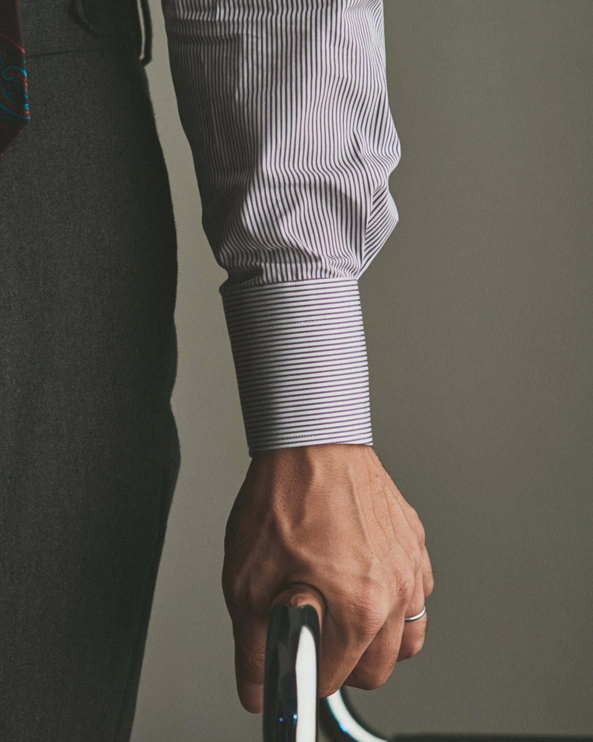 「ドレスシャツでは、襟は必然的に気にされる方が多いと思いますので、ここで着目したいのはカフスのフィットです。手首にピッタリとフィットしたカフスと、空気をはらみふわりと広がる袖のコントラストからは男性の色気が漂います。ジャケットの袖口からチラリと覗く時も、ジャケットを脱いでシャツ一枚になる際も、カフスというのは意外と人の目にさらされるディテールです。もちろんご自身でシャツをあつらえれば、自分の手首とカフスが完璧にフィットするシャツを手にすることができますし、ユナイテッドアローズの既成品ではカフスは台形状にしていて、なるべく手首にフィットするようにつくっています。」