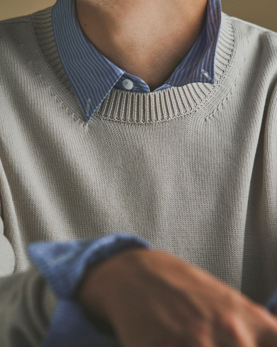 「前提としては、ニットを着ているというだけでどこか上品な雰囲気が出ますよね。カジュアルアイテムで品の良さが演出できるというのはニットならではです。ではこのニットらしさをもっとも象徴しているディテールというとファッションマークがあげられると思います。これはネックや袖、肩などのパーツのつなぎめにある減らし目の跡を指しますが、ここが凄くきれいに仕上がっているとテンションが上がりますよね。いまではデザイン的要素も兼ねている場合もありますので、ニットの印象を左右するディテールと言えると思います。逆にリンキングではなくパーツを縫い合わせている場合は、Tシャツやスウェットシャツなどのカットソー、あるいはニットソーと呼ばれるものになりスポーティな印象ですね」