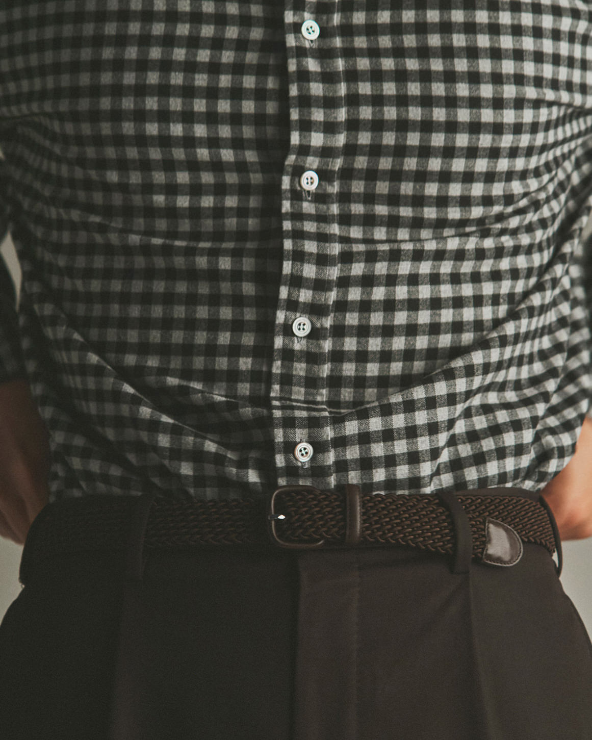 「スタイリングのセオリーとして、ベルトとシューズの色は同色で揃えるということは広く知られていると思います。一方でここ最近はサイドアジャストのパンツやイージーパンツなど、ベルトレスなスタイルも非常に目にするようになりました。ジーンズをベルトレスで履く感じもいいですよね。上半身と下半身を分断しない感じは、全体的にすっきりとした印象が演出できます。そこでベルトとパンツの色を合わせるというのもいいんじゃないかなと思います。ベルトがないと不安っていう場合もありますからね。」