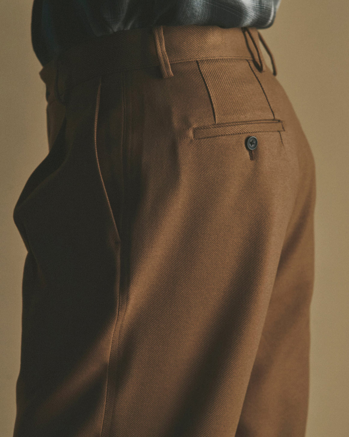 「メンズのスタイリングにおいて全体的な印象を決定づけるのは下半身であることが多いと言われます。パンツとシューズのバランスによってキャラクターが出ますよね。また、パンツのシルエットはなかなかごまかしが効かないので、お気入りのパンツを見つけることは自分らしさを見つける近道と言えるかもしれません。シルエットやレングスで語られることが多いパンツのディテールですが、ここではヒップラインのお話を。ドレスのパンツは基本的には立ち姿がいちばん美しく見えるようにつくられていて、パンツ自体にウエストからヒップにかけてのきれいな曲線を描く工夫がされています。ユナイテッドアローズではこれを取り入れてつくっているカジュアルパンツがいくつかあります。自分ではなかなか見ることができない後ろ姿ですが人からは良く見られる部分ですので、ご試着の際はぜひチェックしてみるといいと思います」