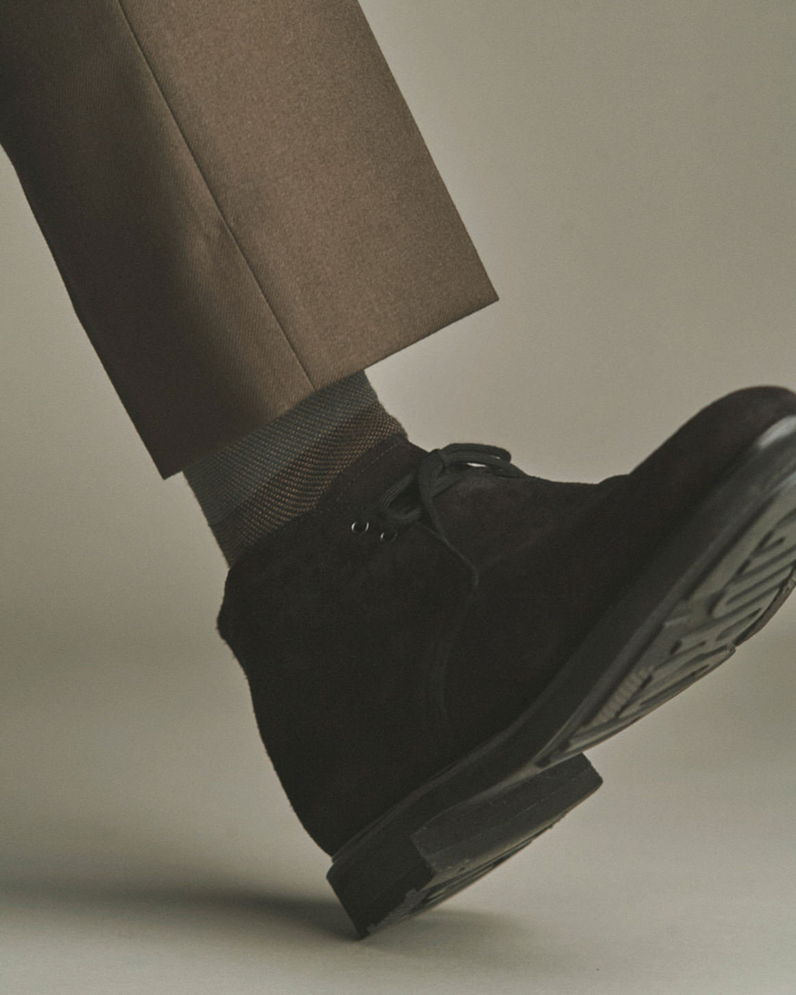 「カラーソックスでスタイリングにアクセントを入れるというのもありますが、上品さを演出するという前提においては印象に残らない靴下ほど印象がいいと言えるかもしれませんね。靴下“だけ”に目がいってしまう場合は、何かが浮いてしまっている可能性があります。極端な例ですが、すごくいいスーツと革靴にスポーツソックスを合わせていたらちょっと幻滅してしまいますよね。ドレススタイルではシューズかパンツの色に合わせるというのがセオリーとしてありますが、全体の洋服のトーンに合わせたり、色を拾ってまとめていくと悪目立ちすることなく全体に馴染んでいくと思います。靴下ひとつで全体が台無しということもあるので、かなりこだわりたいポイントですね」