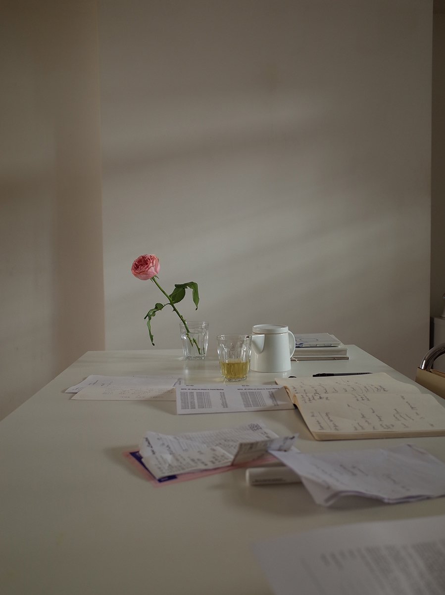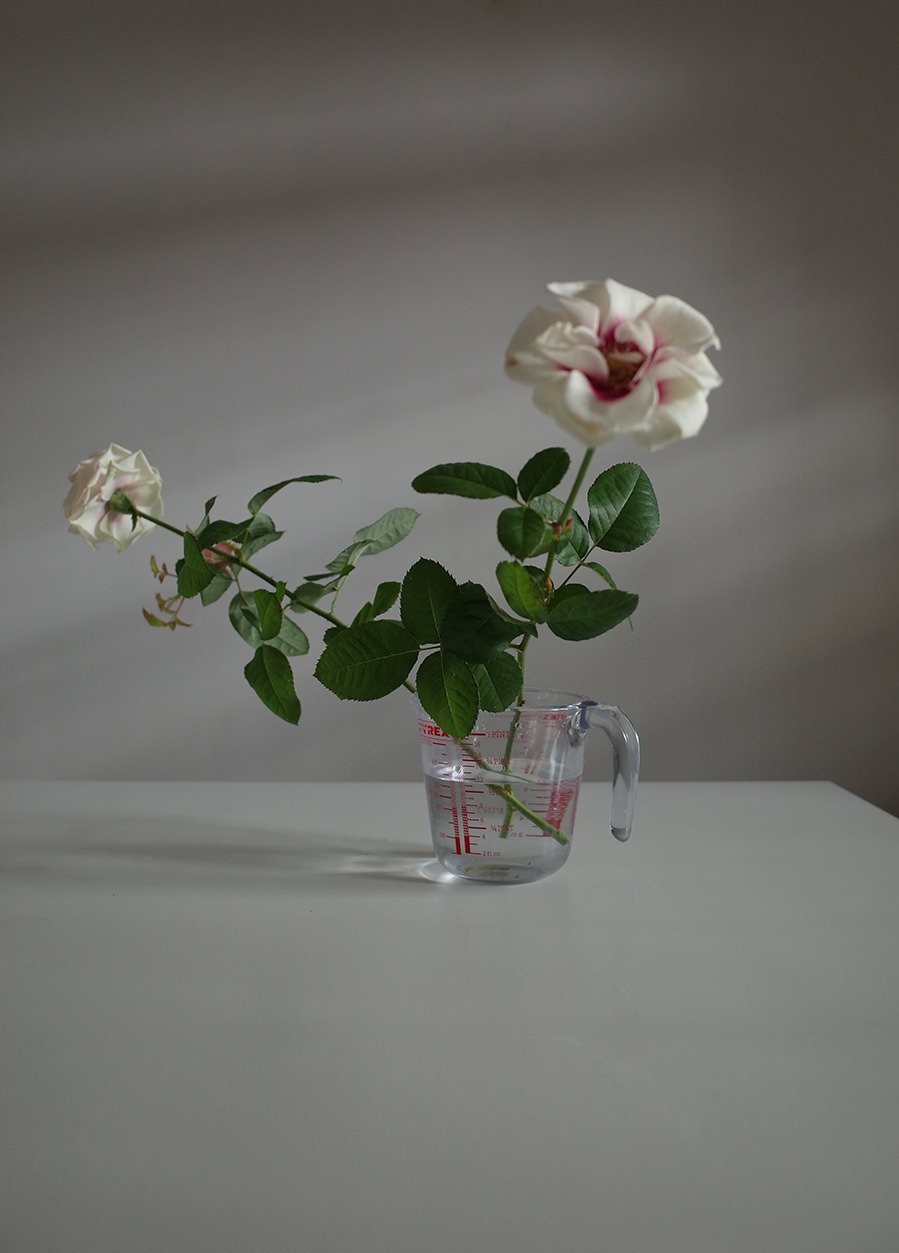 ほとんどの花屋ではもちろん、スーパーマーケットでも買うことができるバラ。そしてトマト缶や捨てるはずのペットボトルやスパークリングウォーターのガラス瓶、いつも使っているコップ。それらを花瓶として、どうすれば買ってきたバラが綺麗に見えるのかをちょっとの間考えてみましょう。いつものリビングの風景が変わるかもしれないし、朝食がいつもより美味しく感じるかもしれない。仕事が捗るかもしれない。また毎朝花瓶のお水を変えてあげるようなルーティーンも生まれ、よりヘルシーな生活をもたらすひとつのきっかけになります。私もかれこれ、太陽が顔を出すちょっと前の4時に起床して、太陽が沈む夕方に仕事を終える生活を続けています」