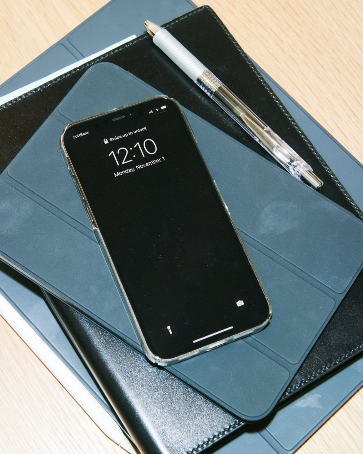 「基本打ち合わせに持っていくものはこれ以上でもこれ以下でもない。スケジュール帳に、iPad2台と<ぺんてる> エナージェル 0.5のクリアボディ」