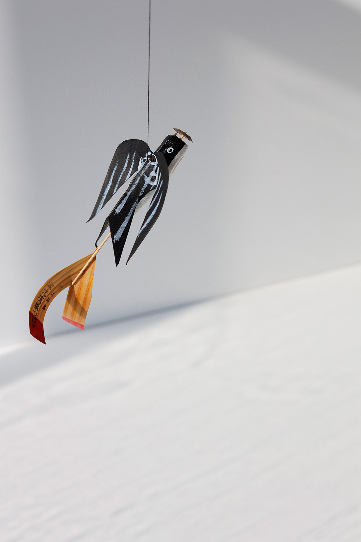 尾張最古刹として知られる寂光院の縁起物。参拝客たちは、このツバメを“田の害虫を食べてくれる観音様の使い”として、田の畔にたくさん立てて五穀豊穣を祈った。風に向けると、ふわりと浮き上がり、尾羽根がくるくると回る。