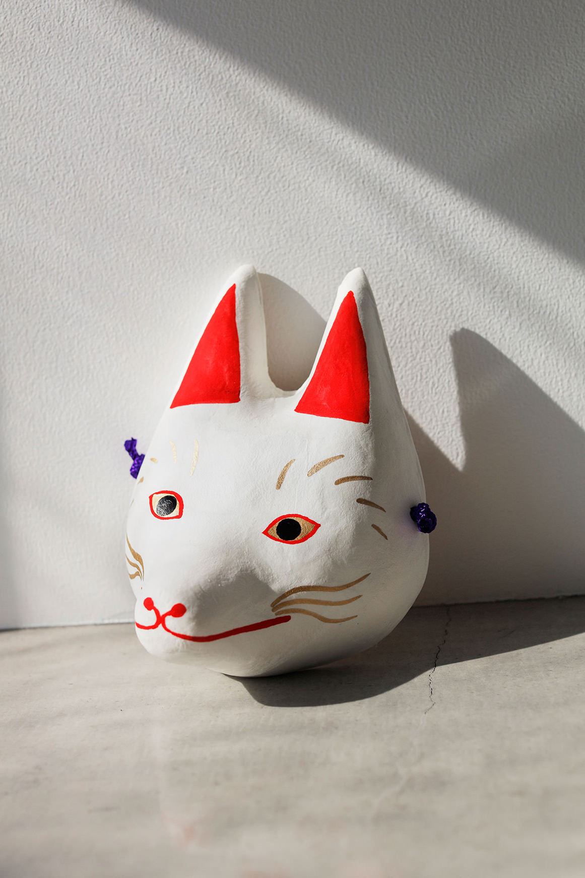 古くから和紙の里として有名な山形県上山市に伝わる張り子の面。現在作られていないものも合わせると約300種も作品がある多彩さが特徴。その中でもこの「いなり狐」は、古くから作られている伝統的なもので、狐は神の使いとされている。