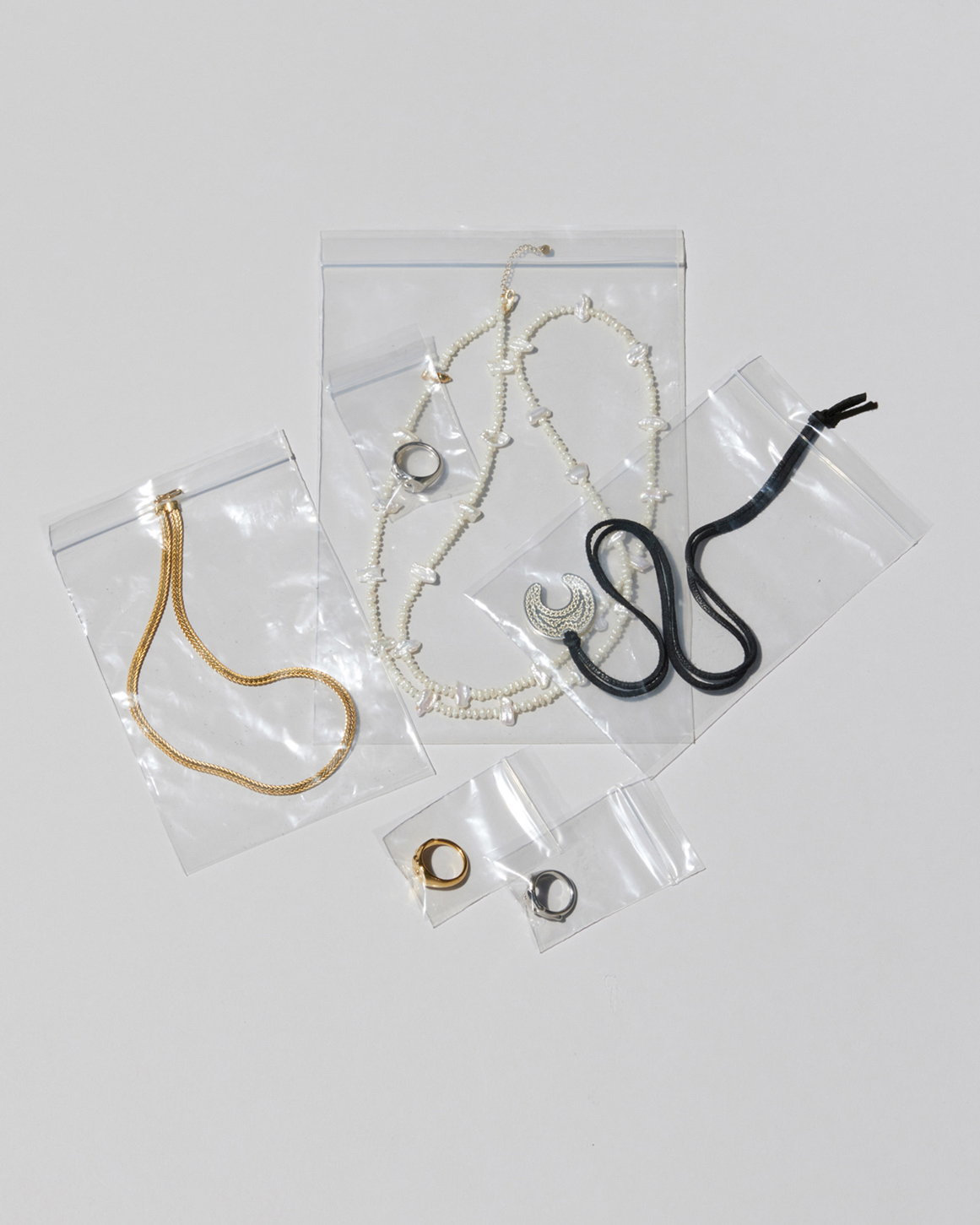 「素材によってもケアの仕方は異なるのですが、基本的にジュエリーは空気や汗などによって酸化し、それが黒ずみだったりの変色してしまう主な原因です。ですから、ジュエリーを外したらティッシュで拭いて空気にあまり触れないように保管するのがベストです。身近なものを活用するのであればジップ付きの袋。実は…あまりみなさまが目にする機会は少ないと思うのですが、工房から物流倉庫、そしてお店に納品されるまで、こうしたジップ付きの袋にジュエリーを入れています。極力空気に触れないように。ジップ付きの袋に入った状態であれば酸化するスピードが明らかに遅いという実体験もあります」