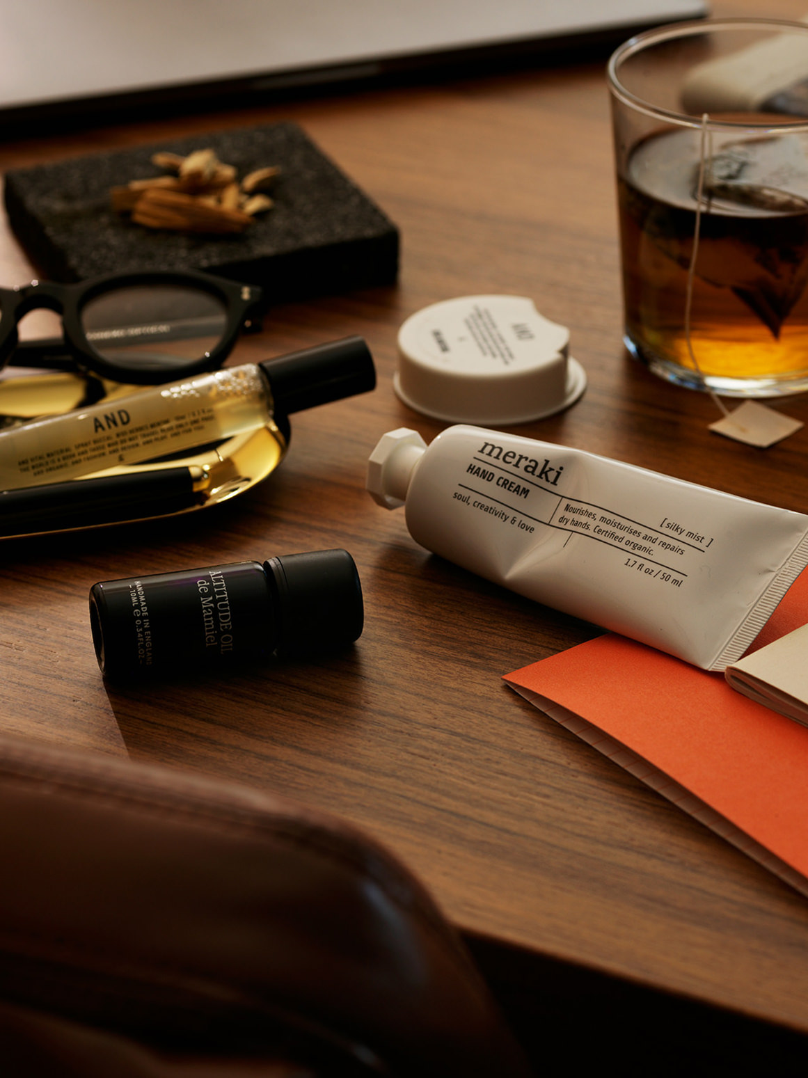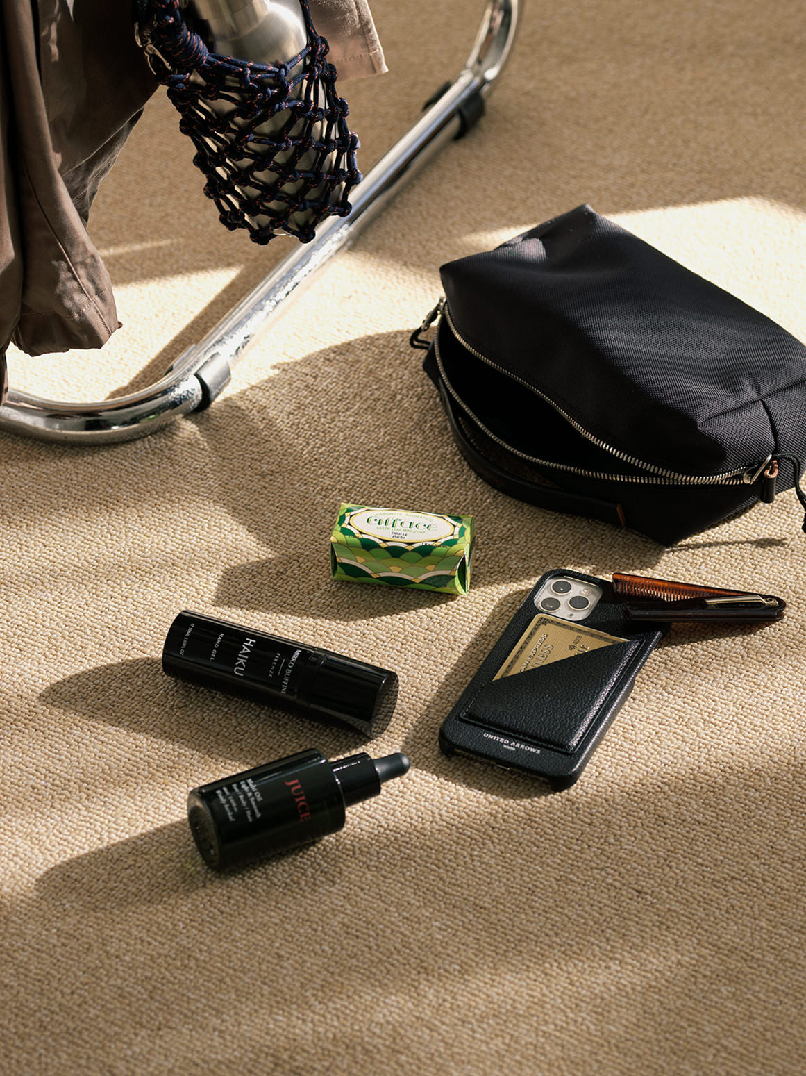 外出時は身軽にいたい、というマインドに応えてくれるのは、スマートフォンのようなプロダクトの多機能性です。例えば除菌スプレー。コロナ禍で、室内に入るときに除菌をすることはもはや当然のマナーになっています。もちろん機能性だけを考えると業務用のアルコールスプレーでもいいのですが、せっかくであれば心地よい香り成分を含んだハンドジェルはいかがでしょう。またマルチオイルはその名前の通りマルチに活躍する便利なアイテムです。除菌後の乾燥した手の保湿はもちろんのこと、ヘアオイルとして崩れてきた髪に塗布しても◎。<JUICE>のオイルであれば、100%天然由来なので安心して使用できます。他にも固形石鹸を携帯する人もいます。手洗いのとき、またホテルや銭湯にあるアメニティや備え付けのものでは満足できない人からのニーズ以外にも、石鹸を「手軽に持ち運べる使い慣れたフレグランス」として携帯する人もいます。柔らかな石鹸の香りがパーソナルスペースに広がります。