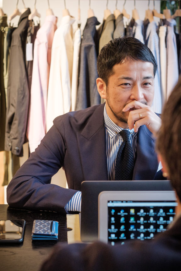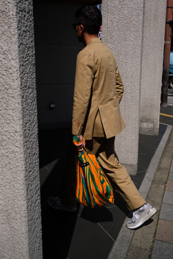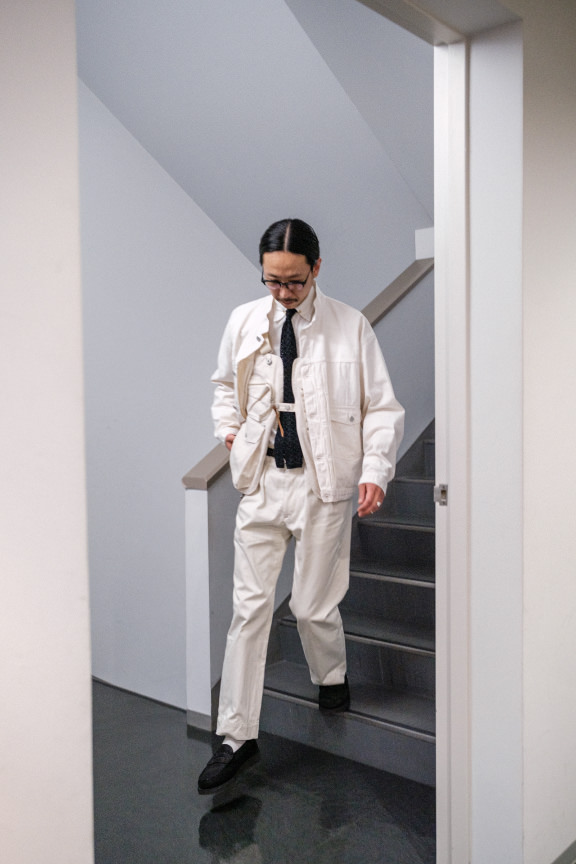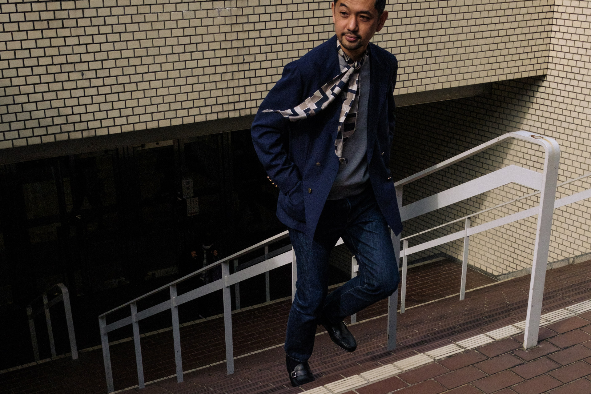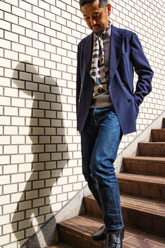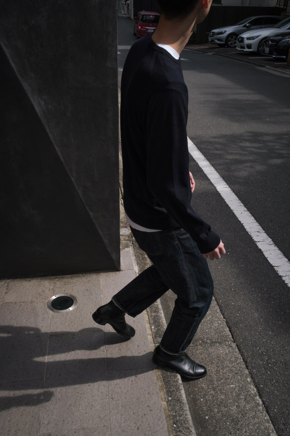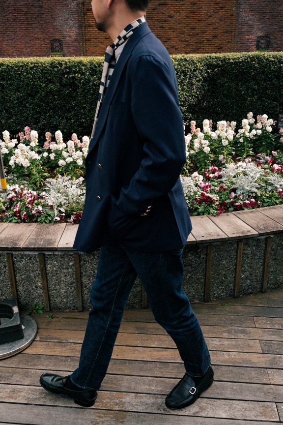 ジーンズこそ、私たちだけではなく非常に多くの方にとって馴染みの深いアイテムだと思います。そんな普遍的なアイテムですが、今回は「ブレザーに合わせるための」というテーマでオリジナルのジーンズを開発しました。腰まわりやワタリには少しゆとりを持たせて、膝下はきれいなテーパードライン。ブレザーだけではなく、ローファーなどのソールが薄いレザーシューズとも相性がよく、上品な印象となっています。ジーンズは本来作業着として相応しいパターンが採用されているわけですが、このジーンズはドレスパンツの考え方を落とし込むことで、立ち姿が美しく見えるように追求しました。そして赤身を抑えたインディゴ色を表現し、スピードが緩やかでメリハリのある色落ちになるように染色の過程で工夫をしています。デニムの風合いやステッチワークなどのジーンズらしいディテールもしっかりと落とし込みつくり上げています。UAの新たな定番ジーンズとしてラインナップ。