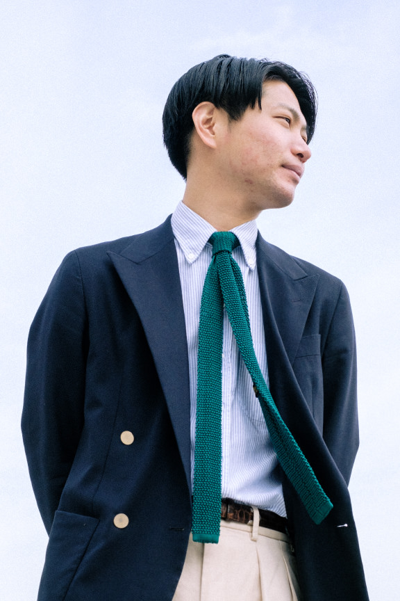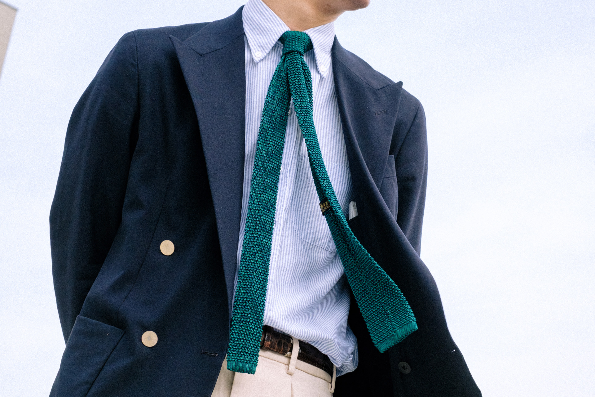 ネクタイの中ではややカジュアルな位置づけのニットタイ。だから当然ジャケットスタイルにはとても馴染みが良いし、スーツスタイルを軽快に見せたいという時にもとても効果的。あるいはニットタイを使ってカジュアルアップにも。そういう意味ではニットタイとローファーは私たちにとってかなり近しいポジションのアイテムと言えます。おしゃれを楽しむためのネクタイとしては、非常に愛用者の多いのがニットタイです。