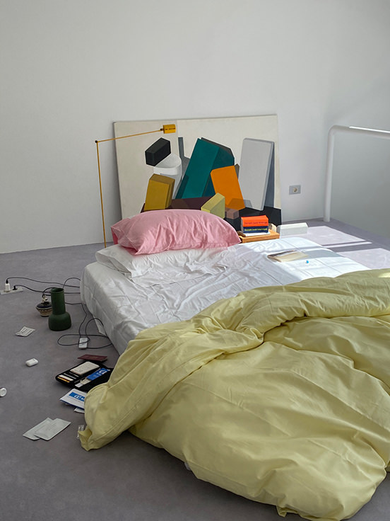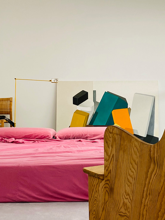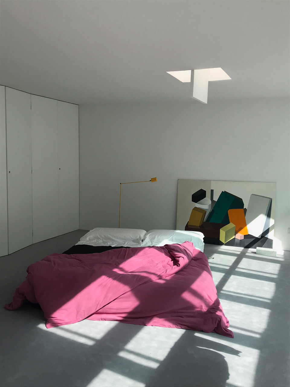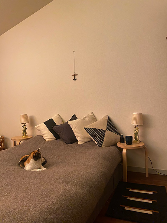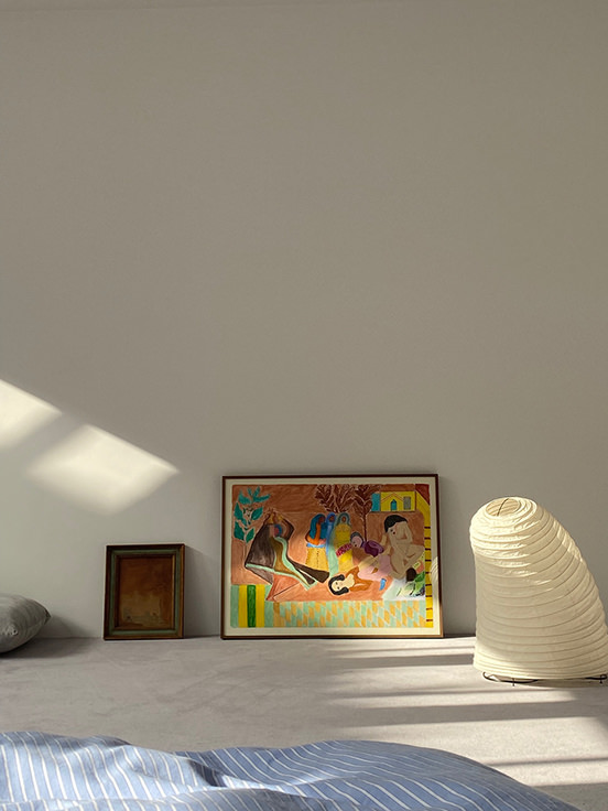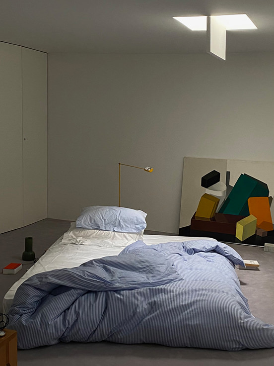 「広くて明るい部屋に最低限の家具。ずっとそんな寝室を持ちたいと願っていました。昔から、和室に布団を敷いて紙製のランプを置いただけの日本家屋のような空間が好きなんです。今までの私の寝室はというと、洋服やモノがぎゅうぎゅうに詰まっていて……。NYに数年住んだ後、バルセロナに戻ったときに、寝室についてあらためて考え直す機会があったんです。それでできたのが今の寝室。グレーのカーペットの上にマットレスを敷いて、ランプを2つ。絵が1枚とわたしがデザインした<Raawii>の水差し、他に小物を少しだけ。それだけの空間です。ベッドリネンはスウェーデンの<Magniberg>。珍しい色と肌触りが好きで、シーツを変えるたびにさまざまな色合わせを楽しんでいます。引っ越しは難しくてもシーツの色を変えれば、手軽に気分転換ができますしね。そして、ベッドの真上にある天窓からたっぷり入る日光を肌で感じる朝の時間が何よりも贅沢なんです」