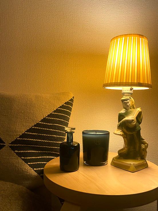 「僕にとってのベッドルームは本当に“眠るだけ”の場所です。仕事の作業や考え事を一切持ち込まず、ただリラックスして寝る。だから携帯電話も触らないし、本も読まない。そんな空間だからこそ、香りはとても重要な役割を持っています。僕は部屋ごとに香りを変えているのですが、寝室は<Perfumer H>の『Ink』という香水をベッドリネンに振っています。ベチパーやシダーウッド、ブラックペッパー、ローズなどがブレンドされていて、エキゾチックだけれど爽やかさのある興味深い香り。これがとてもリラックスできて、入眠効果も高い。うちには2匹の猫がいるのですが、彼らもその香りが好き?なのか僕がベッドに入ると隣に潜り込んできて一緒に寝ています。墨っぽいナチュラルな香りが、匂いに敏感な彼らにとってもちょうど良いんでしょうね。僕の部屋ではあるのだけど、彼らがどう感じるのかも大切にしています。我が家でのヒエラルキーは彼らの方が上なので(笑)」
