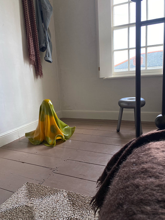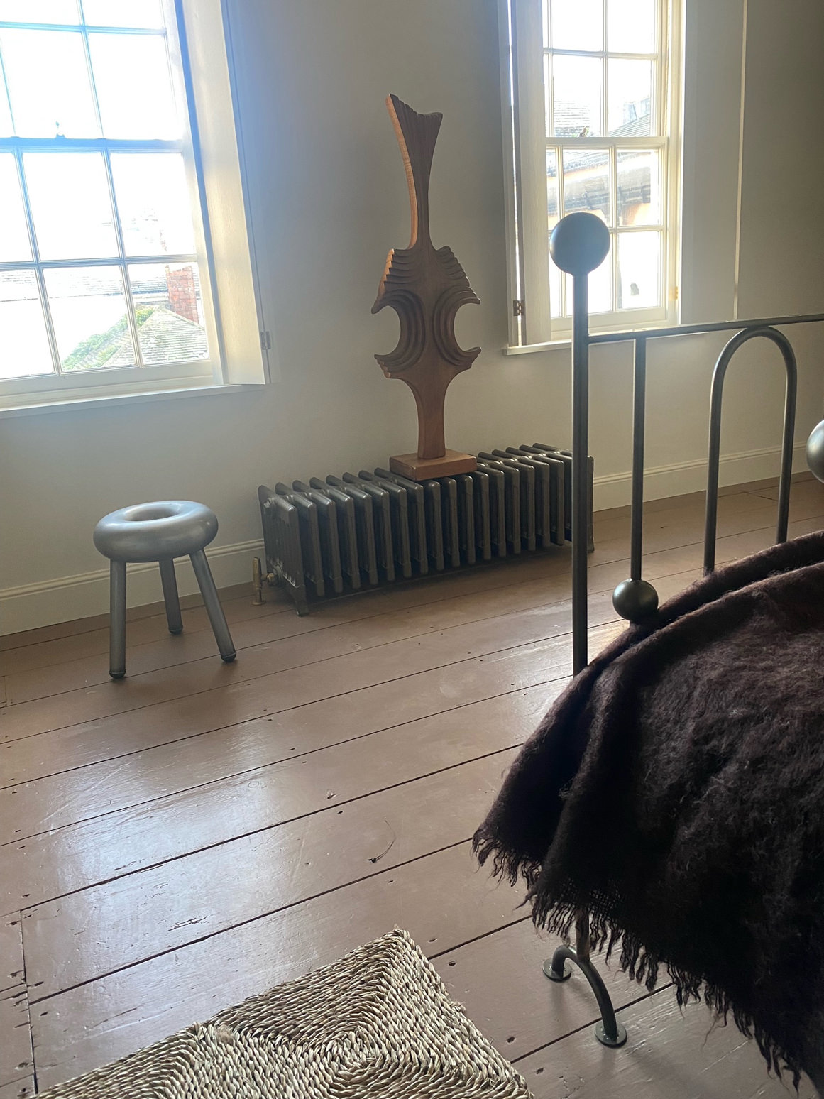 「私のベッドルームにあるのは、<Dean Edmonds>のベッド、クローゼット代わりのシェルフ、それとスカルプチャーをはじめとするたくさんのアートたち。大半は私の友人が作っているユニークな作品です。彫刻が多いのは、それが光の影響を大きく受けるから。目覚めと同時に朝の光をたっぷりと浴びた彫刻作品を眺めるのは、寝室だからこそ味わえる特別な時間です。ただ美しいだけではなく、それを作っているクリエーターの考えや思いを理解しているから、なおさら愛着が湧きますね。私自身は服装もスタイリングの仕事もシンプルなものが好きなので、寝室に関していうと少し装飾的に見えるかもしれません。でも表現の方法が違うだけで、そこにあるのは、私とパートナーの一貫した好みや感覚です。最近引っ越しをして少し部屋が変わっていますが、ベッドルームはその時々の気持ちが反映されるもの。だからこそ、移り変わる様子を楽しんでいきたいですね」