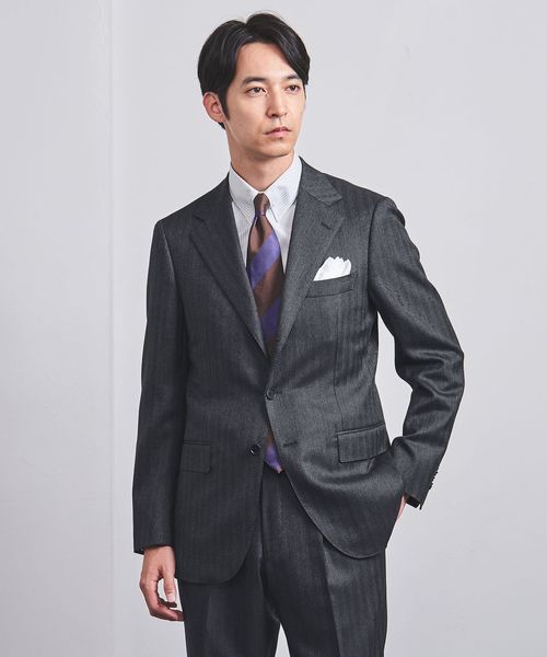 ミックス感のあるグレーのヘリンボーン生地を使用した、上品かつモダンな印象のスーツ。