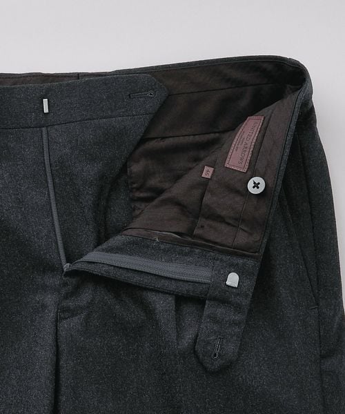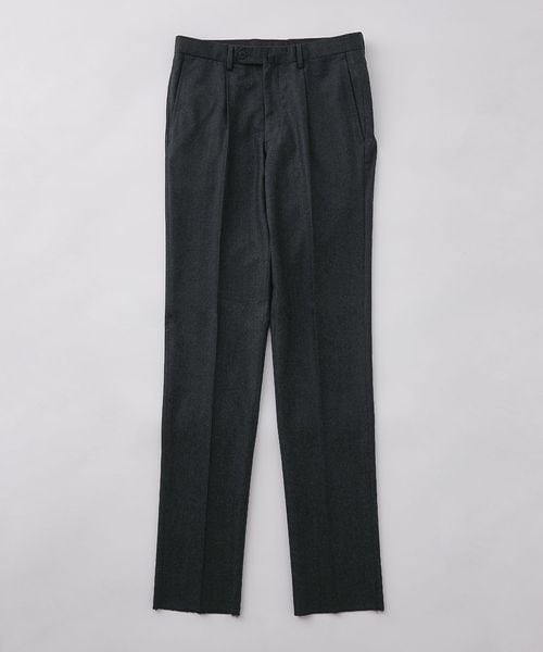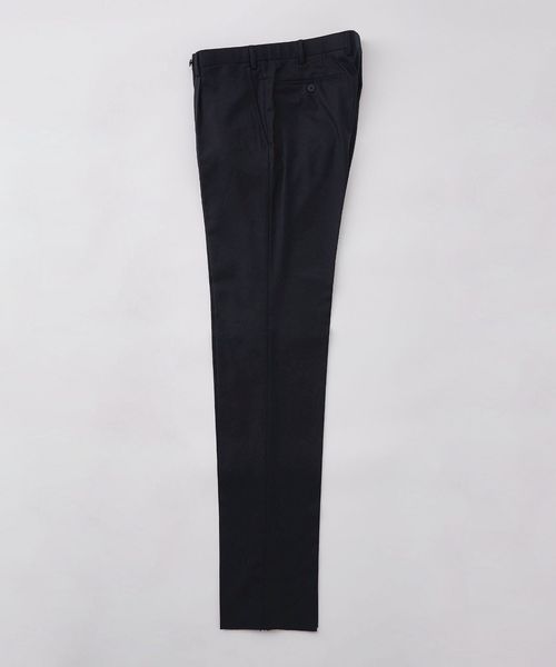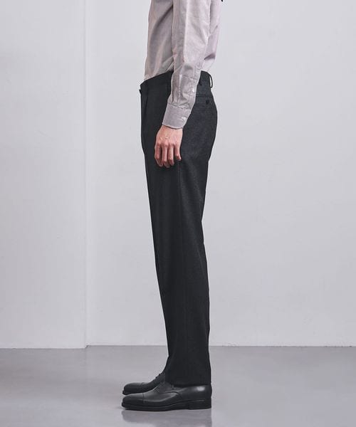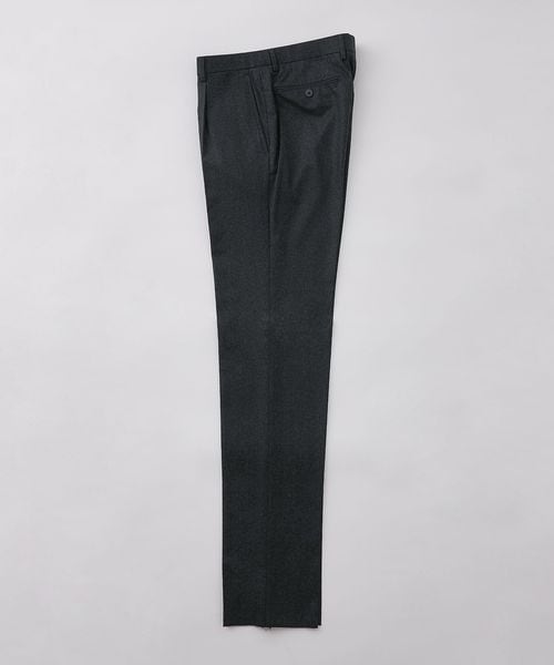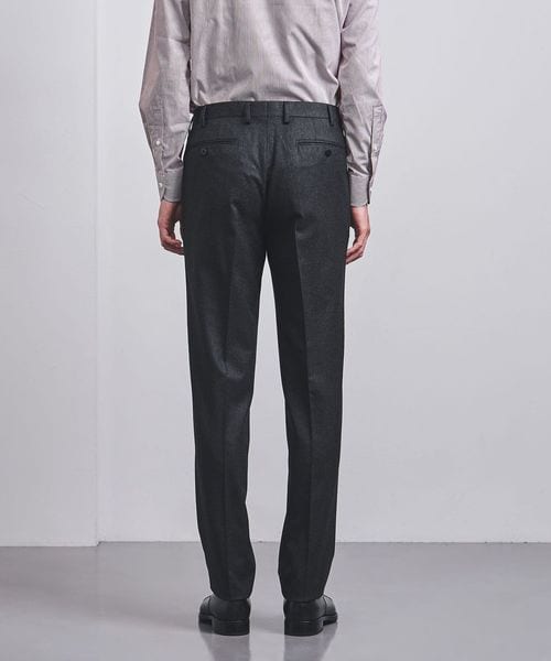 スラックスは上着のシルエットに合わせた、やや深めの股上と、膝巾や裾巾を広げたストレート気味のラインです。