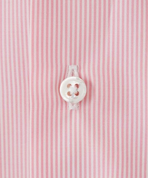 Vゾーンを華やかに彩るピンクカラーのキャンディストライプシャツ。
