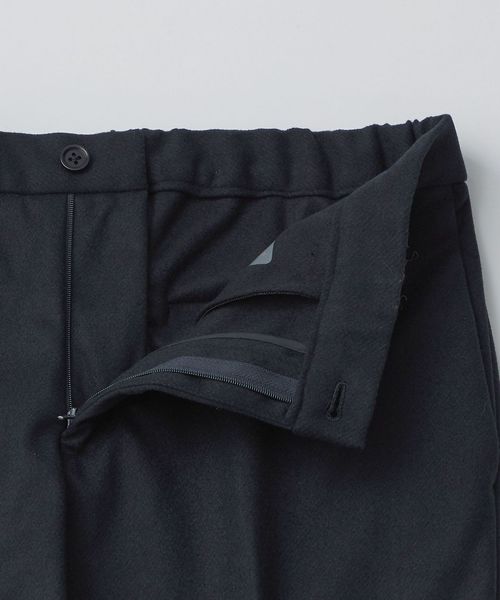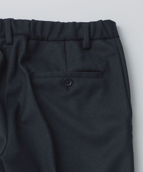 素材のやわらかさと動きやすいパターン設計、またウエストのバックシャーリング(ゴム入り)仕様により、快適でイージーなはき心地とビジネスシーンにも相応しいスマートな佇まいを実現させています。