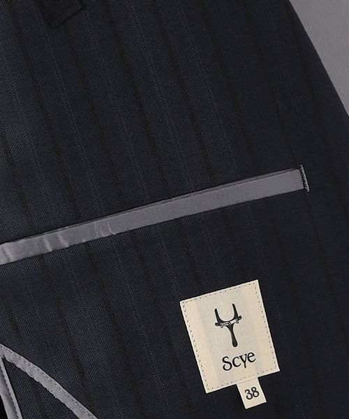 19世紀のエドワーディアンスタイルにみられる英国式のテーラリングをクリエーションのベースに現代的な解釈を加え・再構築することでクラシックとモダンの融合した新しいスタイルを提案。表層的なデザインのみならず・服の本質ともいえる素材・カッティングや内部構造にも配慮したアナトミカルな服作りを特徴とし・クオリティの高い服作りを目指す。ブランド名「Scye」は・テーラー用語で袖ぐり・鎌の意。
