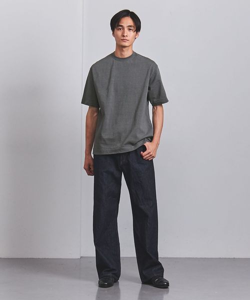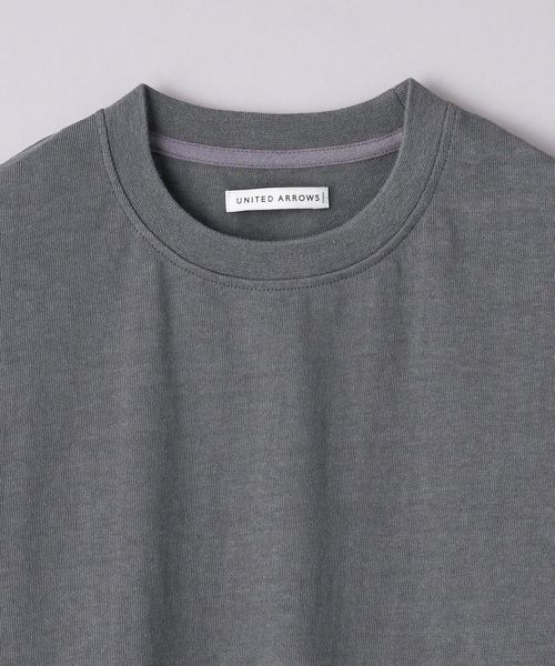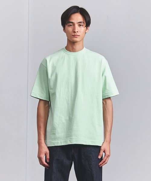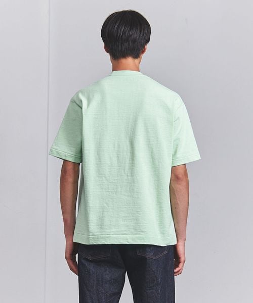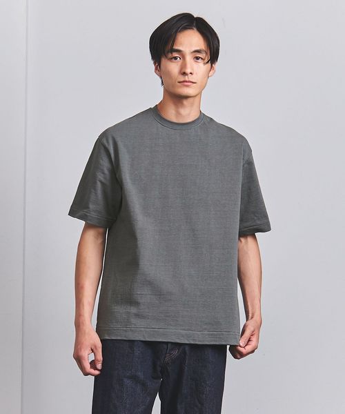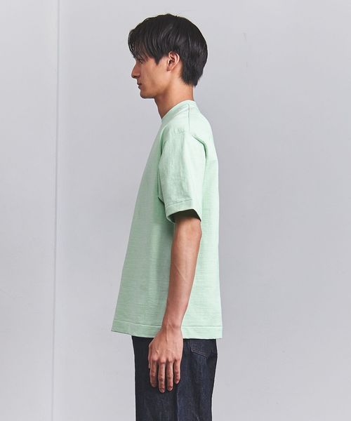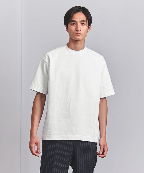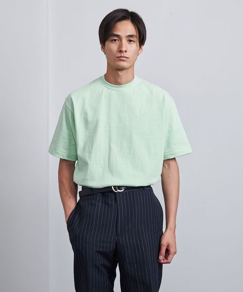 UAオリジナルのムラ糸を使用。密度を詰めて編んだ天竺組織のコットン素材は、ヘビーウェイト感のある見た目にナチュラルな凹凸感など雰囲気のある佇まいです。