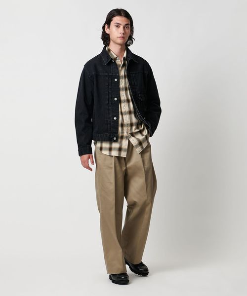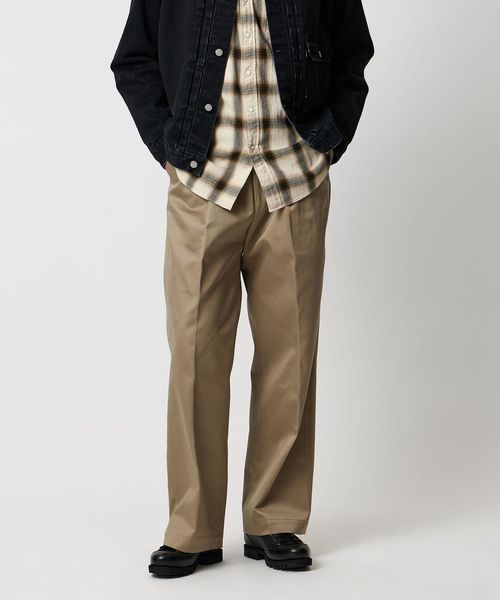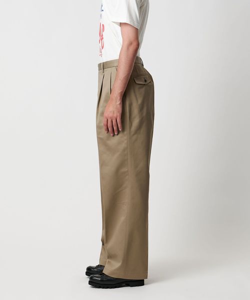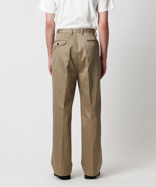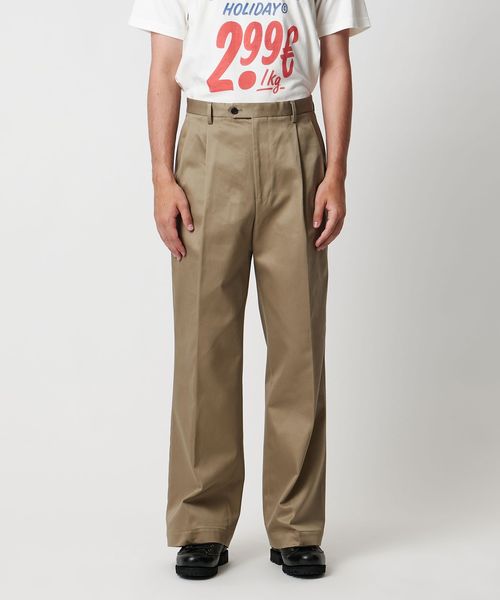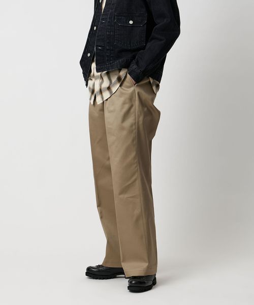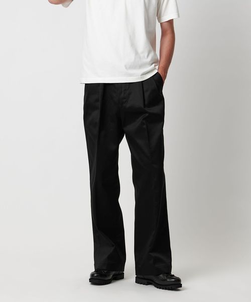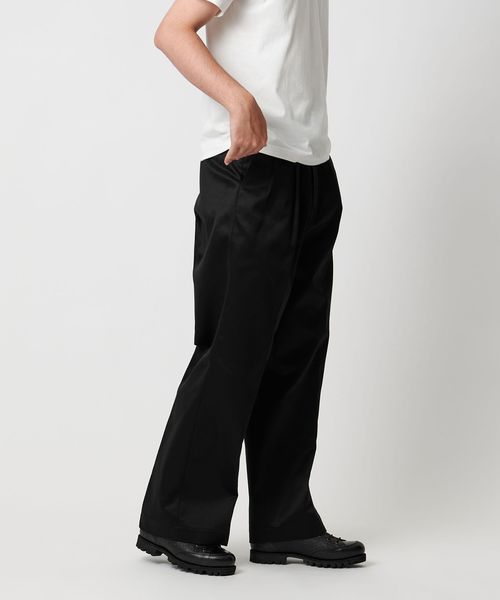 素材のハリ感を活かした立体的なワイドシルエットが特徴の2プリーツパンツ。