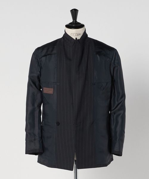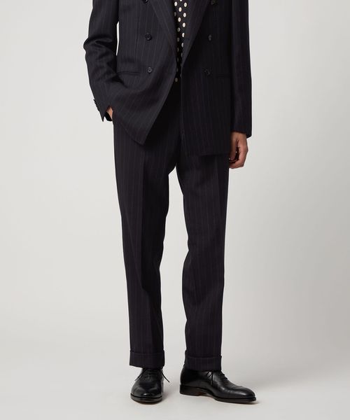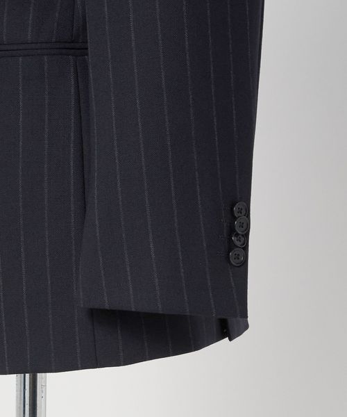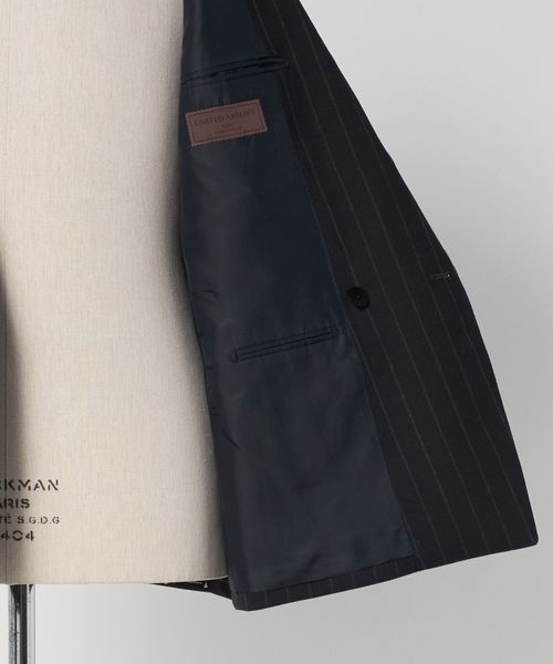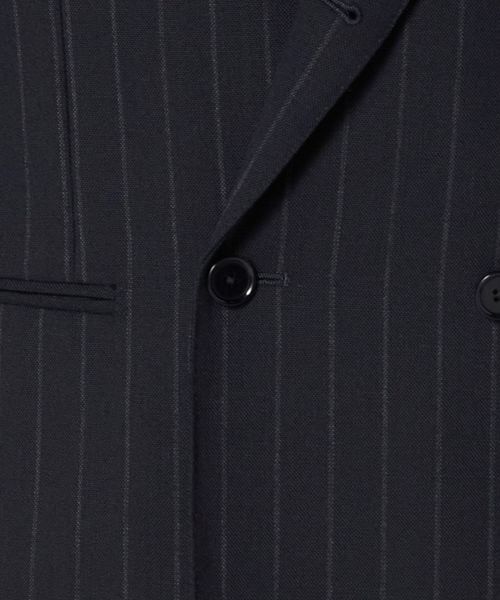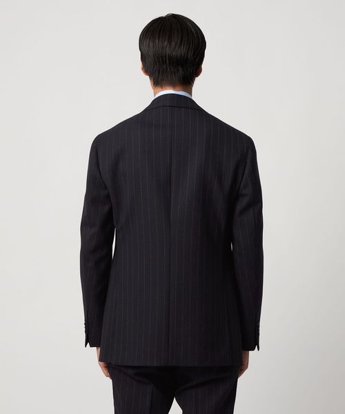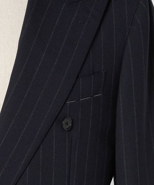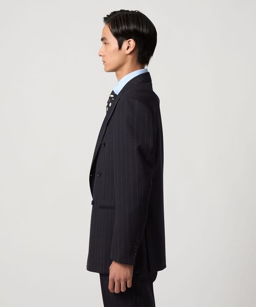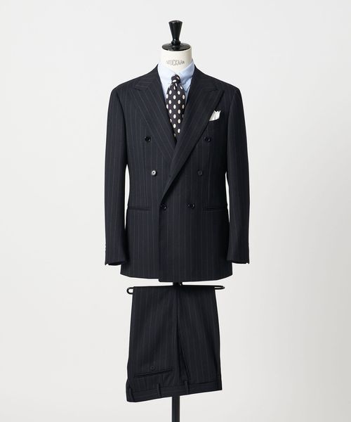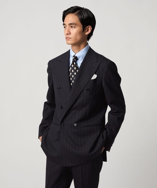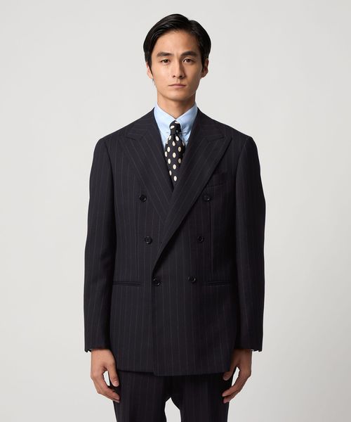 クラシカルな雰囲気と、英国調のオーセンティックなストライプ柄の意匠が際立つ、6ボタン ダブルブレストスーツ。