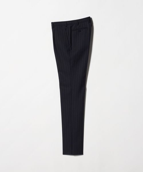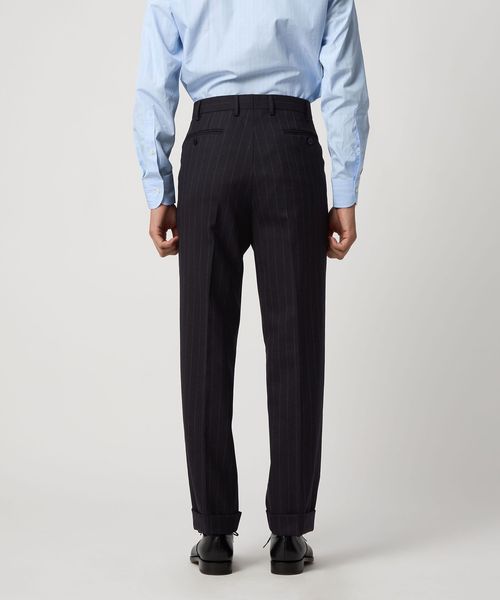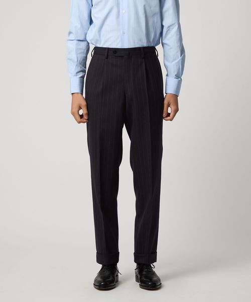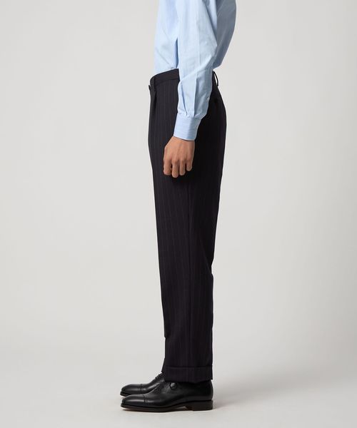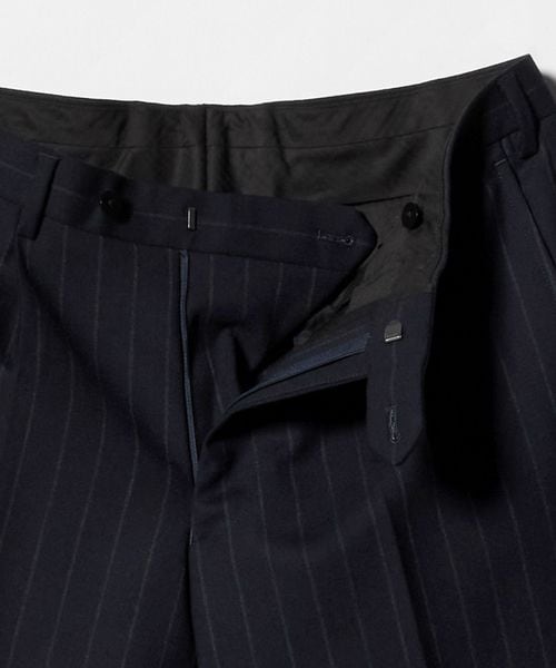 尾州の山栄毛織に依頼した英国調の平織りワイドストライプ柄のウール生地を使用。