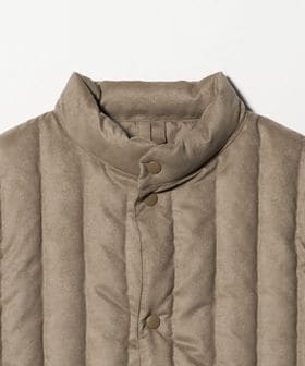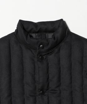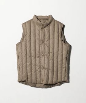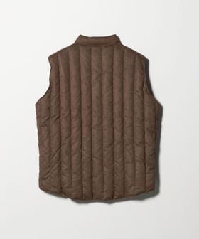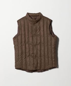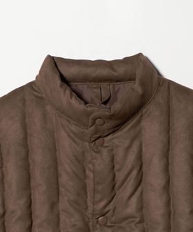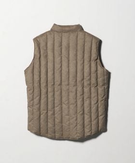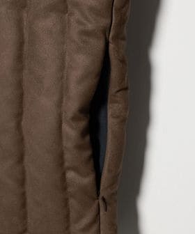 表地にマットな質感のスエードライク素材を使用した別注ダウンベスト。