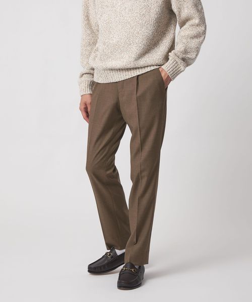 ミルド加工で柔らかく温かみのある風合いに仕上げ、ウールの上品さと快適な穿き心地を両立しています。