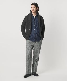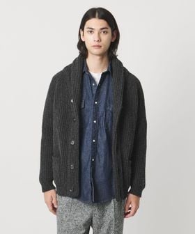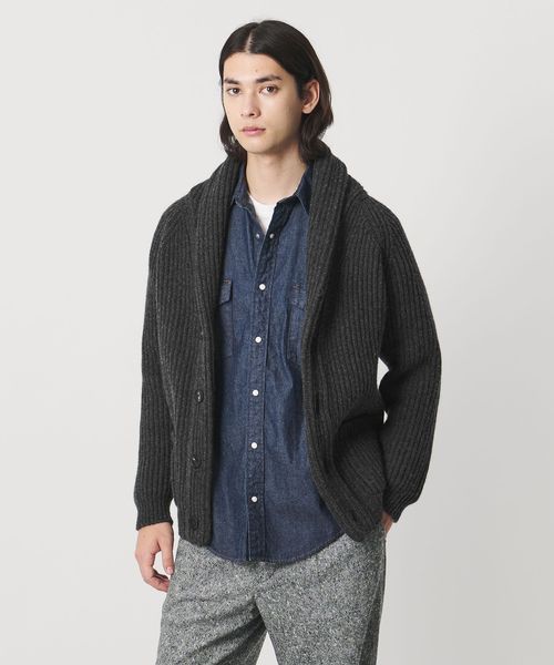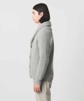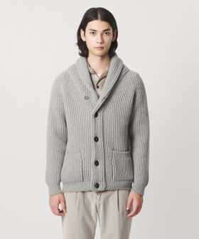 ボタンの数をインラインからひとつ減らし、モダンなバランスに仕上げた別注ショールカラーカーディガン。