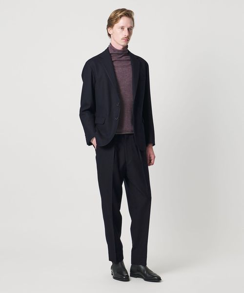 ノーネクタイでのニットやカットソーとのコーディネートを想定したセットアップモデル。
