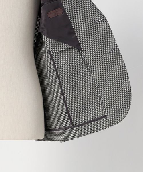 極力芯地を省き、軽い仕立てながらスーツのようにきちんと感を演出する普遍的なデザインバランスと、コンパクトですっきりとしたシルエット、ナチュラルなショルダーラインが特徴です。
