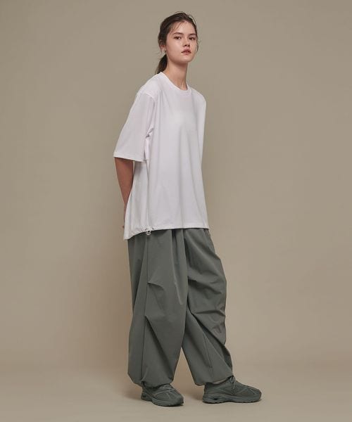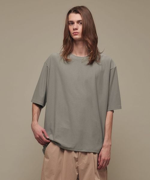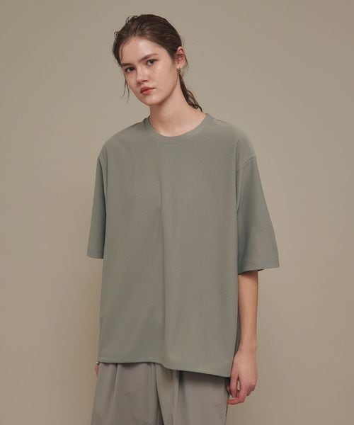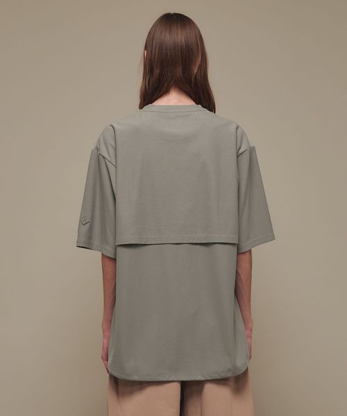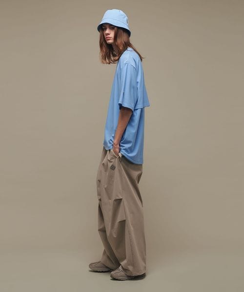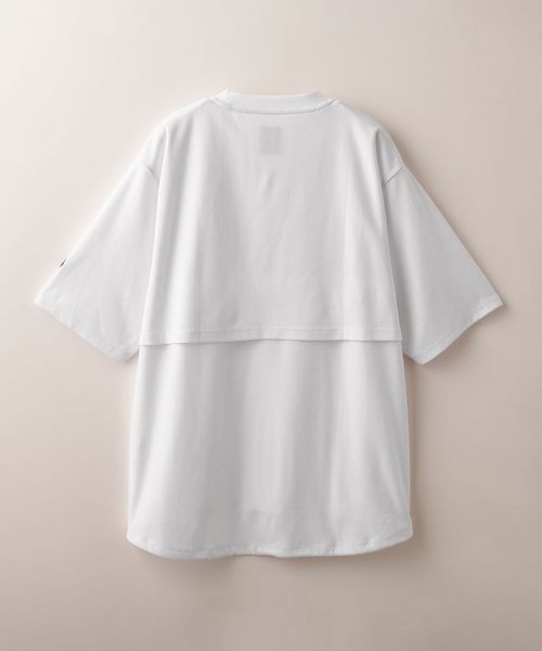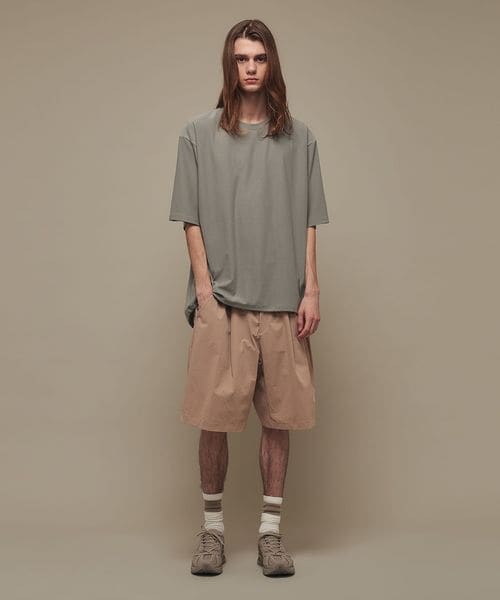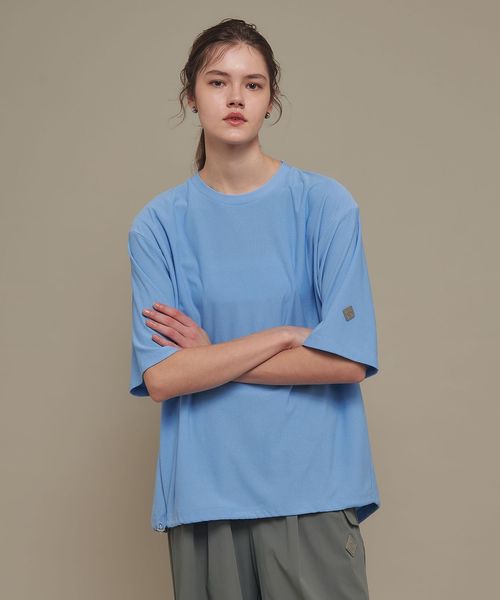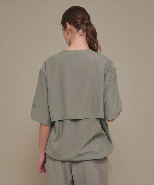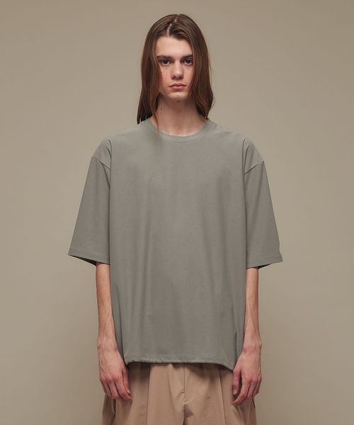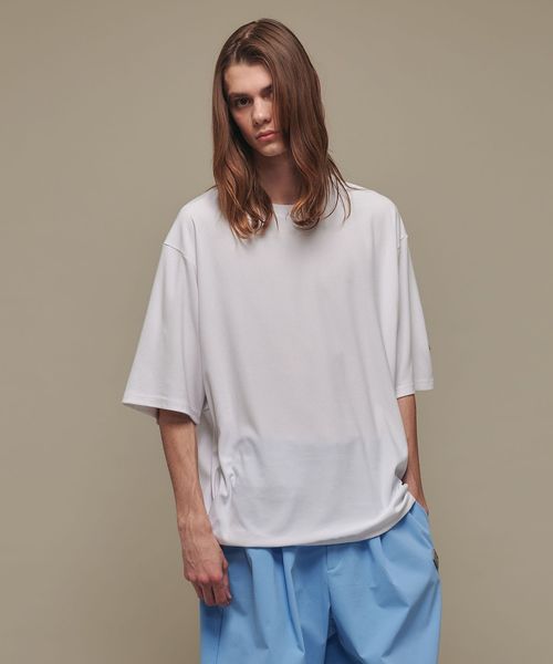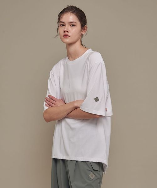 適度なゆとりを持たせたリラックスシルエットが特徴のハーフスリーブTシャツ。糸の段階でふくらみと弾力を高める特殊な加工を施し、ポリエステルの丈夫さを保ちながら、コットンのようなナチュラルな風合いを実現しました。背中には通気性を高めるベンチレーションを配置し、機能性とデザイン性を両立。さらに、ヘムにはドローコードを内蔵し、シルエットに変化をつけることが可能です。吸水性/速乾性や消臭機能も備えており、快適な着心地を提供します。袖口にはコラボロゴ入りの樹脂ネームを付け、ディテールにもこだわりました。