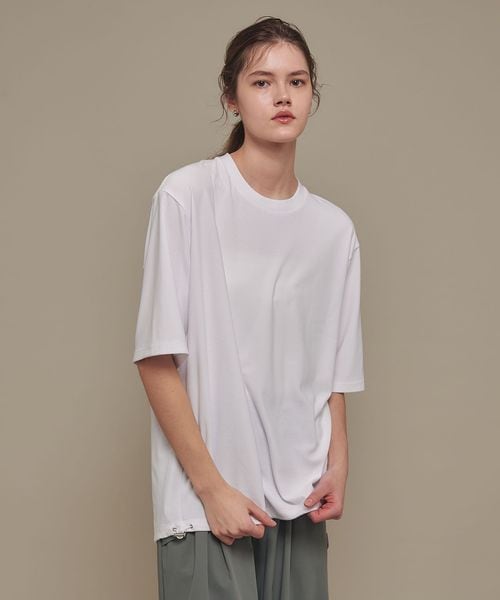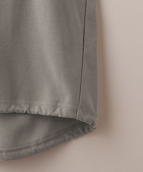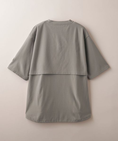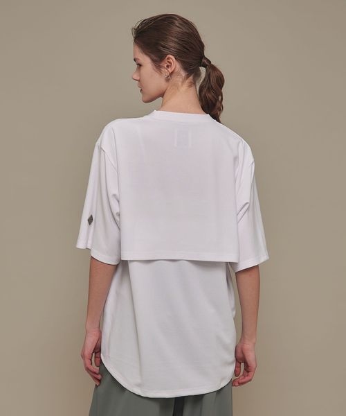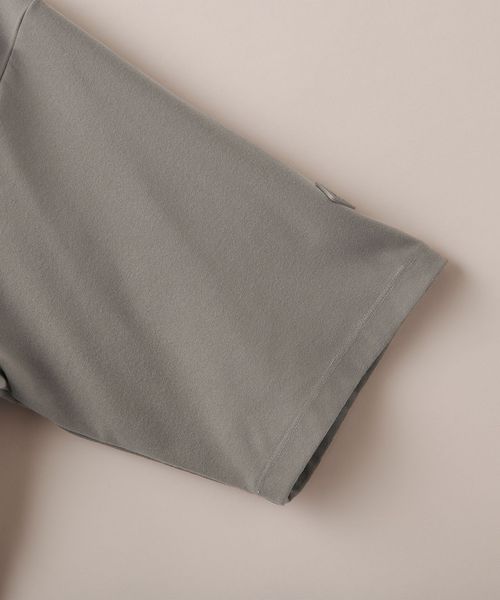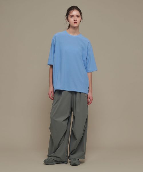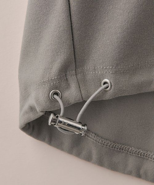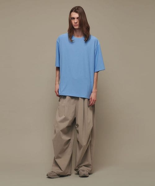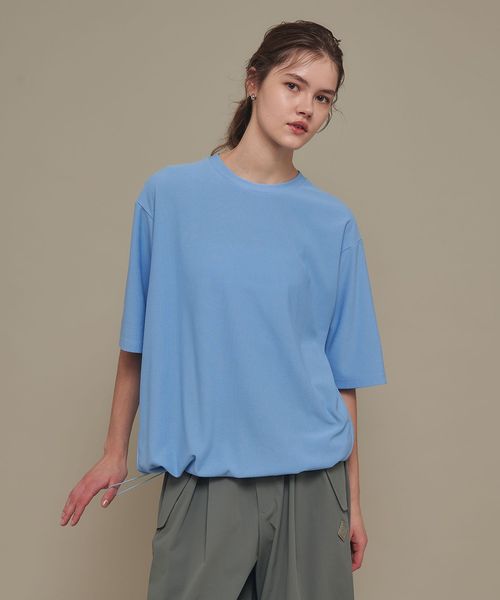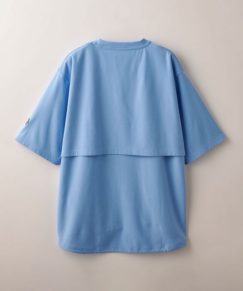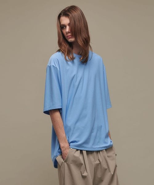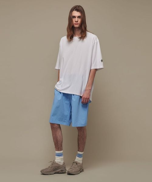 適度なゆとりを持たせたリラックスシルエットが特徴のハーフスリーブTシャツ。糸の段階でふくらみと弾力を高める特殊な加工を施し、ポリエステルの丈夫さを保ちながら、コットンのようなナチュラルな風合いを実現しました。背中には通気性を高めるベンチレーションを配置し、機能性とデザイン性を両立。さらに、ヘムにはドローコードを内蔵し、シルエットに変化をつけることが可能です。吸水性/速乾性や消臭機能も備えており、快適な着心地を提供します。袖口にはコラボロゴ入りの樹脂ネームを付け、ディテールにもこだわりました。