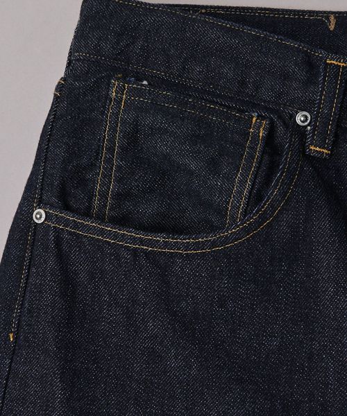 生地は白耳右綾デニムを使用し、ワンウォッシュ加工を施しています。