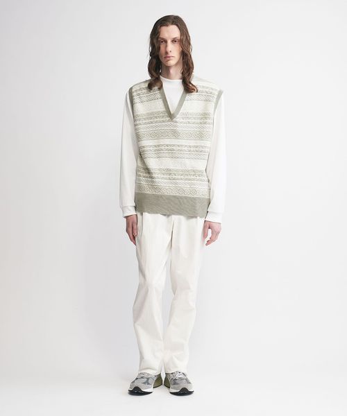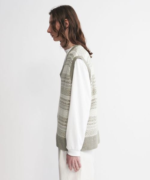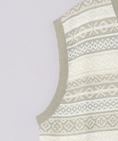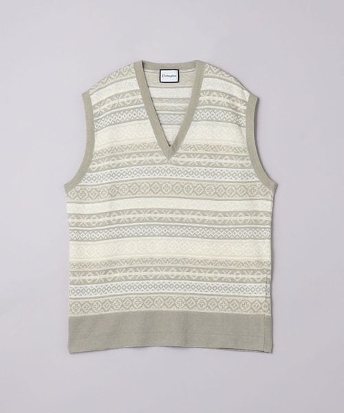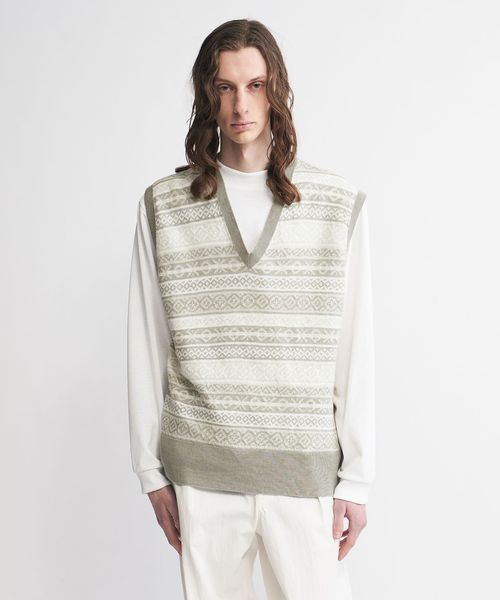 同系色の3色で組み合わせたフェアアイル柄のニットベストを別注。
