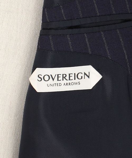 <SOVEREIGN> を代表するハンドメイドラインのチョークストライプ柄ダブル6ボタンスーツ。