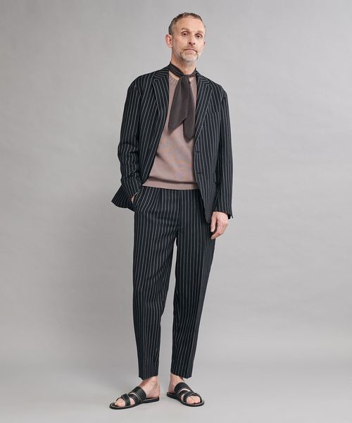 ノーネクタイでのニットやカットソーとのコーディネートを想定したセットアップモデル。
