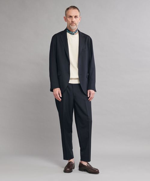 ノーネクタイでのニットやカットソーとのコーディネートを想定したセットアップモデル。