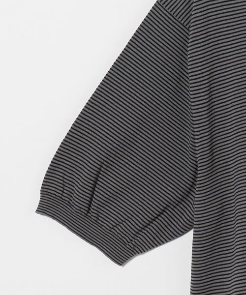 小振りな衿元に2つボタンがスッキリとした印象に。マイクロボーダー柄がモダンな雰囲気を醸し出します。