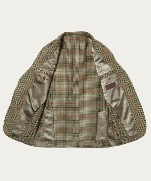 段返り3つ釦のややワイドなラペルデザインや、身体に自然に沿うナチュラルシェイプとソフトで丸みのあるショルダーラインが特徴です。流行にとらわれない普遍的な魅力のある一着です。