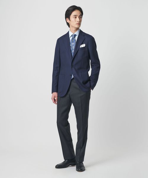 ストライプや小紋柄のネクタイを合わせれば、程よいアクセントが加わり、会議や商談でも好印象に。