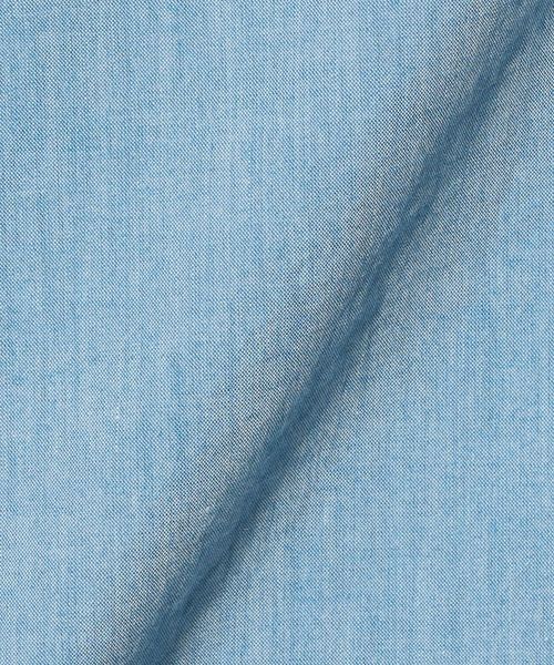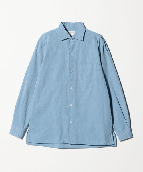 やわらかなワンピースカラーとやや深めのスリットが入ったスクエアカットの裾を特徴としたシャンブレーシャツ。