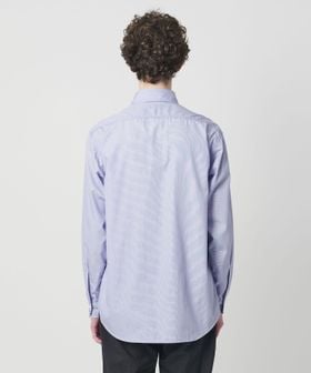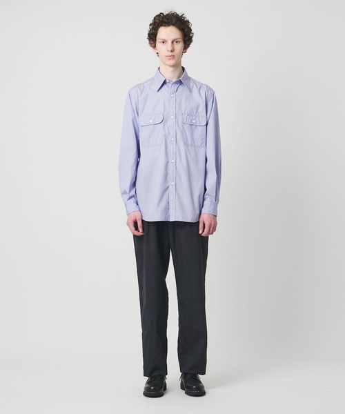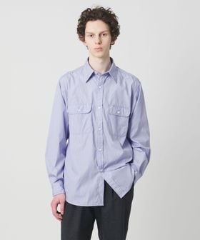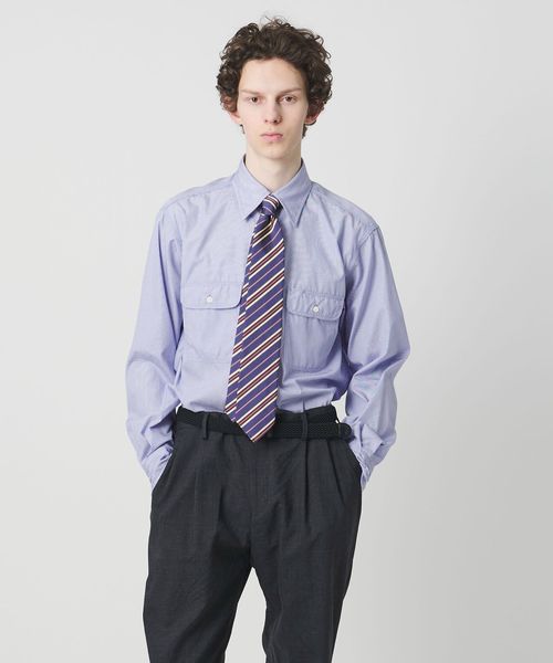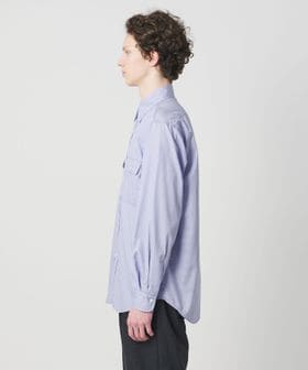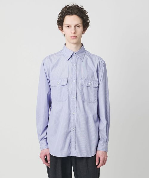 太番手の糸でステッチを効かせたダブルポケットのワークシャツに、ブルーストライプのドレスシャツ生地を組み合わせ、衿元にはネクタイが結べるタイスペースを設計し、ワークとドレスの要素を融合したデザインが特徴です。