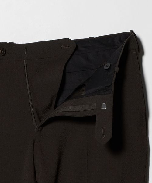 ウールにポリエステルを複合したシアサッカー素材を使用しています。表面の凹凸が涼しげな表情を生み、肌離れの良いタッチが特徴です。ポリエステルの扱いやすさに加え、ウール特有のソフトでしなやかな風合いが落ち着いた印象を与えます。