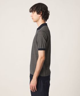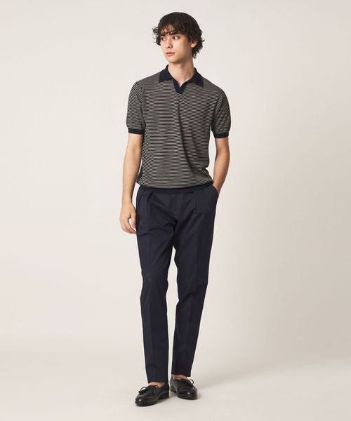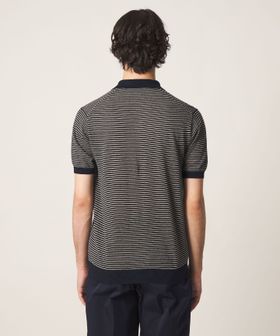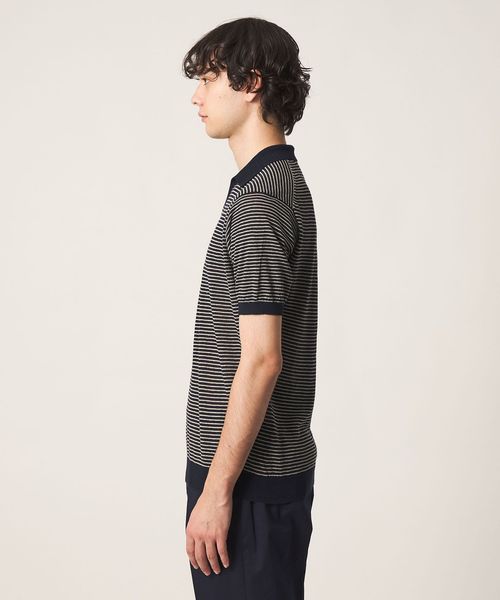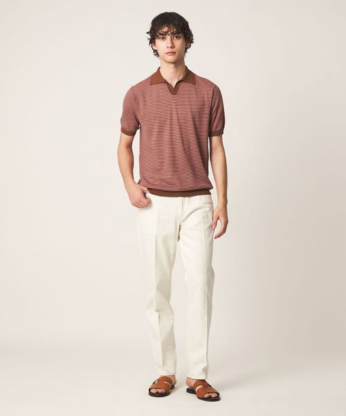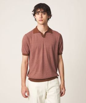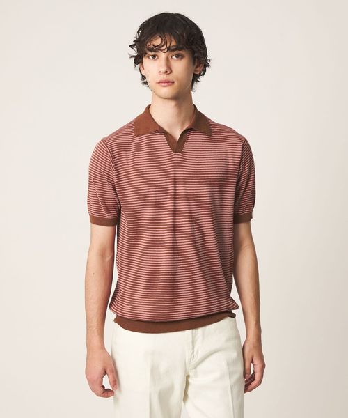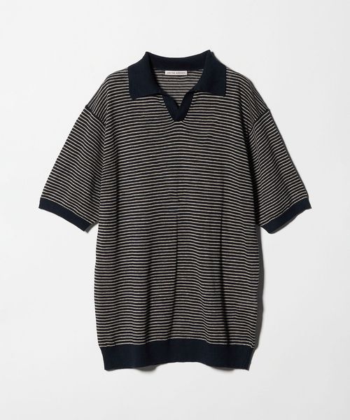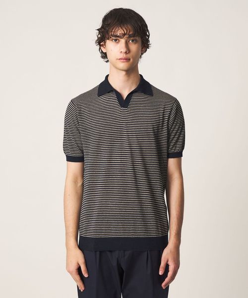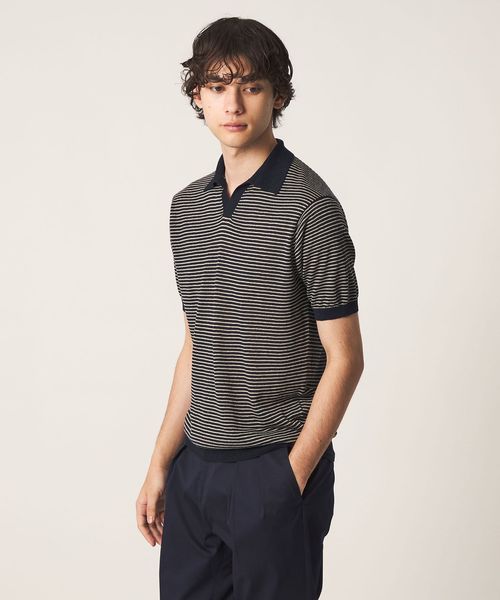 リネン/コットン ボーダー スキッパー ポロシャツ