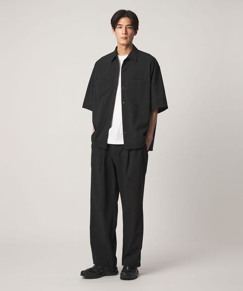 上下で着用することで、カジュアルな素材感でありながら全体が引き締まり、半袖でもきちんとした印象に仕上がります。