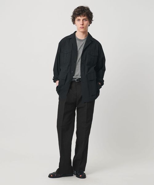 ウールとリネンをブレンドしたトロピカル素材にタンブラー加工を施し、自然な凹凸感とドライな風合いを引き出しています。
