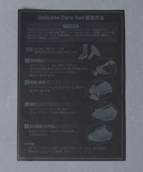 ソフトレザー用のデリケートクリーム(無色・ブラック/各1個)をはじめ、ステインリムーバー、シューズブラシ、クロス、グローブクロス、竹ブラシの計7点がワンセットに。