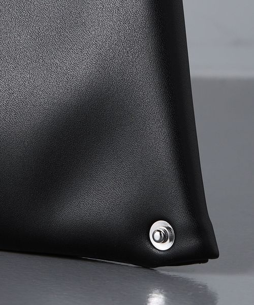 あづま袋を思わせるユニークなバッグ。上品な光沢が映えるシンプルな作りです。太番手の配色ステッチがアクセントとして効いています。下部のスナップボタンを留めることでシルエットに変化を加えられ、アレンジが広がるのも魅力。内布にはロゴの総柄を使用しています。