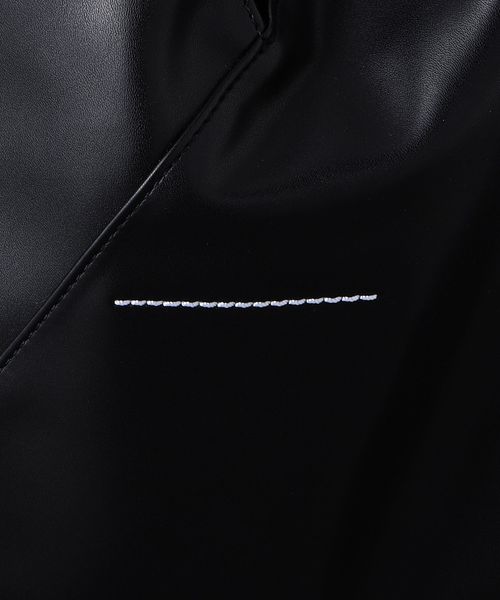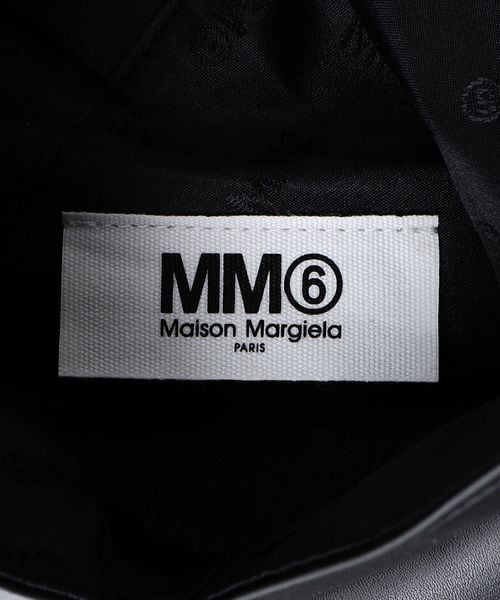 ガーメントやアクセサリーの背面には、白いシングルステッチでエムエム6のラベルが縫い付けられています。