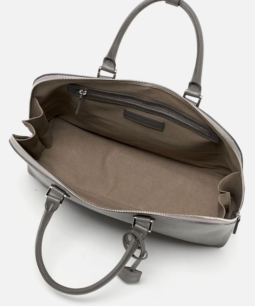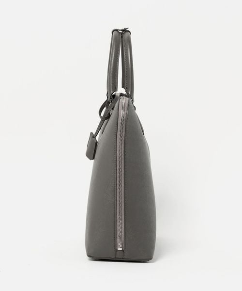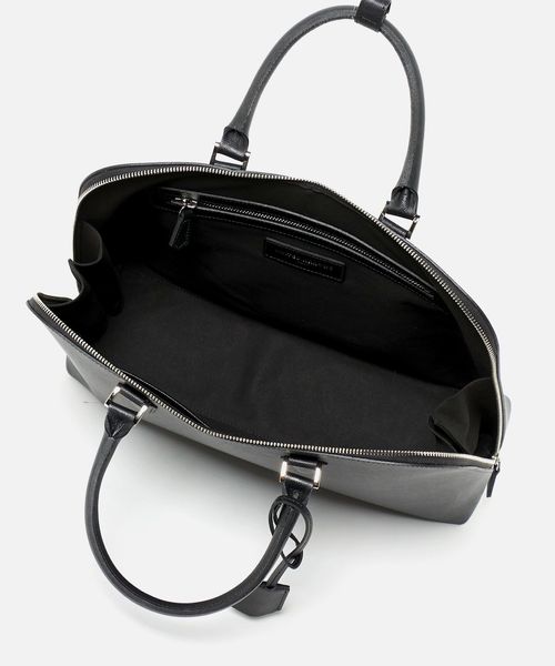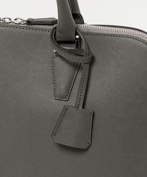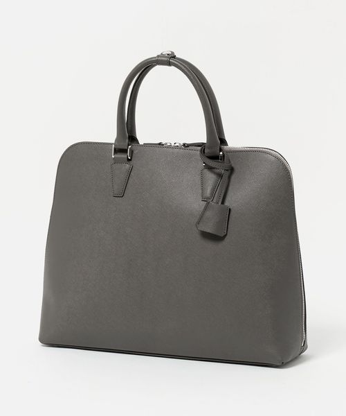 装飾を省いたシンプルなフォルムに、ヘアラインの型押しが映えるラウンド型ビジネスバッグ。